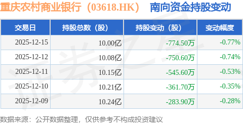 证券之星消息,12月15日南向资金减持774.5万股重庆农村商业银行(03618.HK)。近5个交易日中,获南向资金减持的有5天,累计净减持2716.3万股。近20个交易日中,获南向资金减持的有18天,累计净减持5590.2万股。截至目前,南向资金持有重庆农村商业银行(03618.HK)10.0亿股,占公司已发行普通股的39.79%。