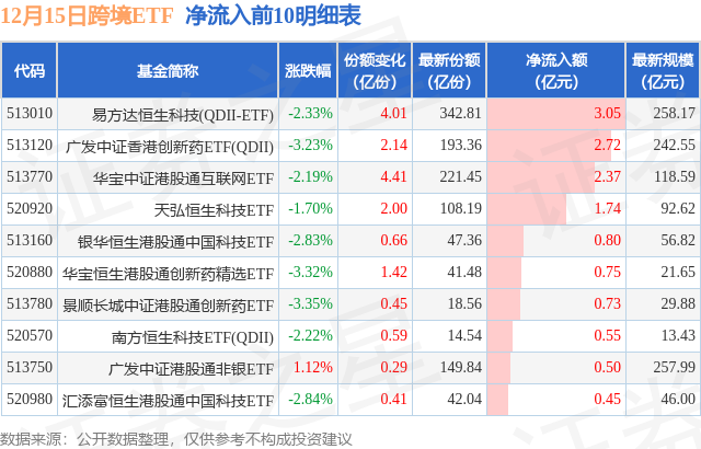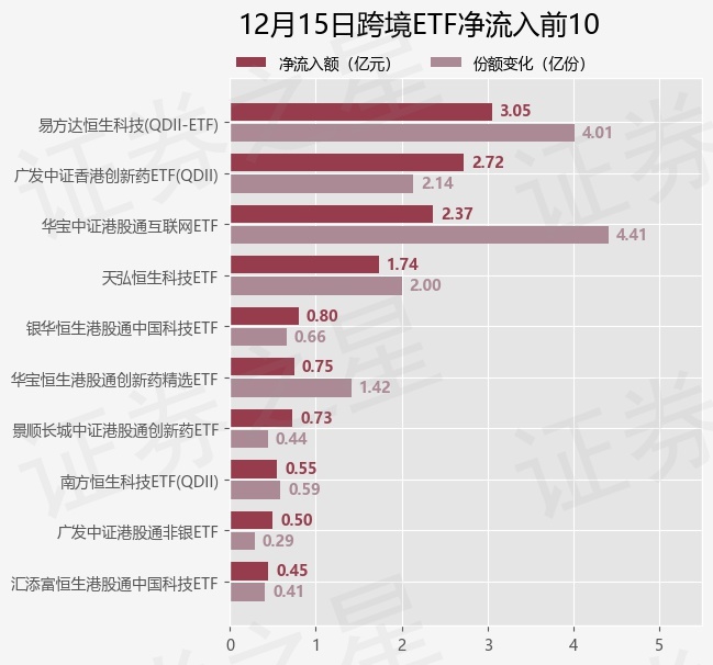 当日有45只跨境ETF基金出现资金净流入,其中净流入排首位的是易方达恒生科技(QDII-ETF)(513010),份额增加了4.01亿份,净流入额为3.05亿元。