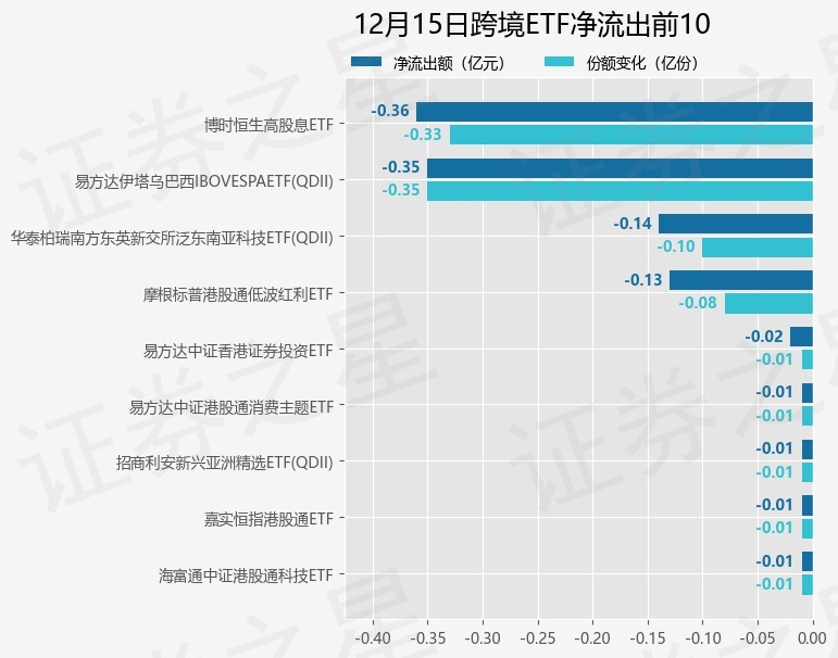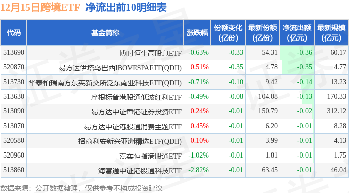 当日有9只跨境ETF基金出现资金净流出,其中净流出排首位的是博时恒生高股息ETF(513690),份额减少了3300.0万份,净流出额为3642.49万元。