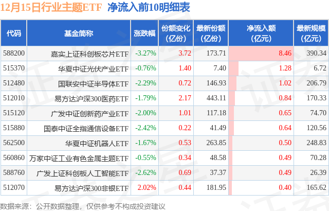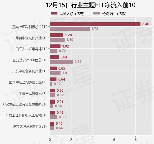 当日有84只行业主题ETF基金出现资金净流入,其中净流入排首位的是嘉实上证科创板芯片ETF(588200),份额增加了3.72亿份,净流入额为8.46亿元。