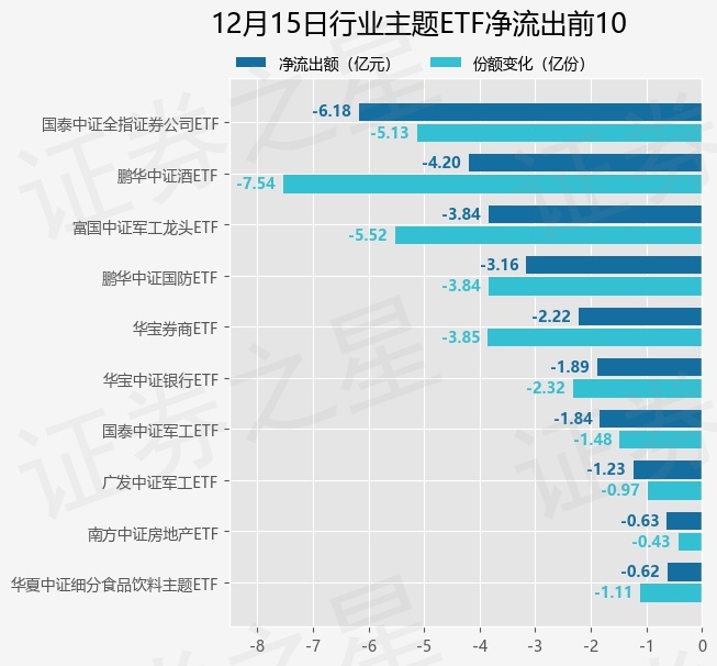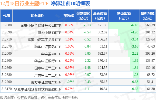 当日有114只行业主题ETF基金出现资金净流出,其中净流出排首位的是国泰中证全指证券公司ETF(512880),份额减少了5.13亿份,净流出额为6.18亿元。