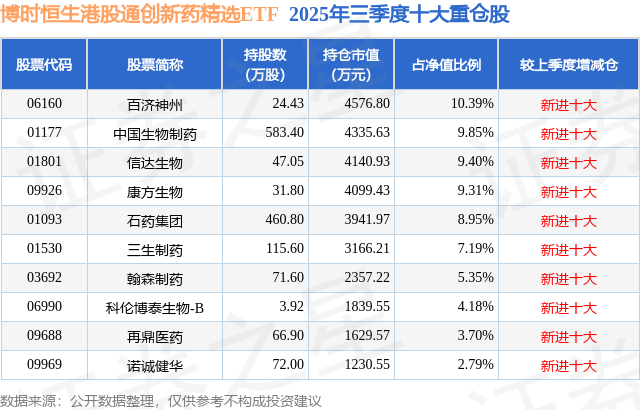 博时恒生港股通创新药精选ETF基金成立于2025年7月23日,基金经理为王萌,基金跟踪标的为恒生港股通创新药精选指数,成立以来超额回报为-6.62%,近一个月超额回报为-0.18%。最新披露的基金持仓数据显示,截止2025年9月30日,该基金第一大重仓股为百济神州(06160),持股占比为10.39%。
