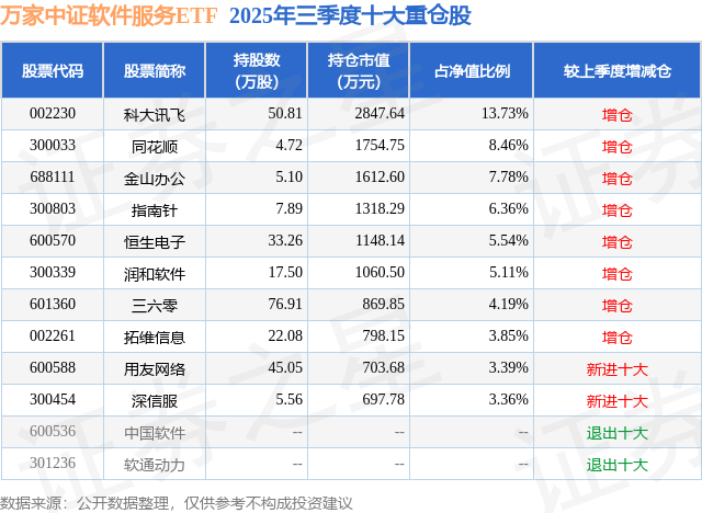 万家中证软件服务ETF基金成立于2024年6月13日,基金经理为贺方舟,基金跟踪标的为中证软件服务指数,成立以来超额回报为3.52%,近一个月超额回报为0.48%。最新披露的基金持仓数据显示,截止2025年9月30日,该基金第一大重仓股为科大讯飞(002230),持股占比为13.73%。