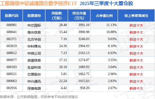 工银瑞信中证诚通国企数字经济ETF基金成立于2025年5月21日,基金经理为史宝珖,基金跟踪标的为中证诚通国企数字经济指数,成立以来超额回报为1.52%,近一个月超额回报为0.46%。最新披露的基金持仓数据显示,截止2025年9月30日,该基金第一大重仓股为中芯国际(688981),持股占比为11.13%。