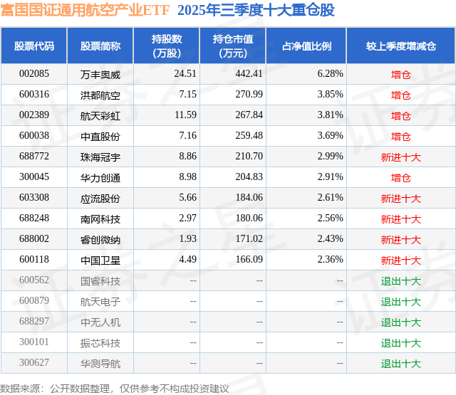 富国国证通用航空产业ETF基金成立于2025年4月30日,基金经理为殷钦怡,基金跟踪标的为国证通用航空产业指数,成立以来超额回报为-10.63%,近一个月超额回报为-0.06%。最新披露的基金持仓数据显示,截止2025年9月30日,该基金第一大重仓股为万丰奥威(002085),持股占比为6.28%。