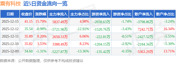 证券之星消息,截至2025年12月15日收盘,震有科技(688418)报收于41.15元,上涨15.79%,换手率15.17%,成交量29.22万手,成交额11.73亿元。