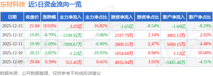 证券之星消息,截至2025年12月15日收盘,东材科技(601208)报收于21.84元,上涨10.03%,涨停,换手率9.16%,成交量93.27万手,成交额19.31亿元。