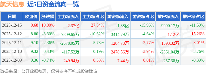证券之星消息,截至2025年12月15日收盘,航天信息(600271)报收于9.68元,上涨10.0%,涨停,换手率4.93%,成交量91.33万手,成交额8.62亿元。
