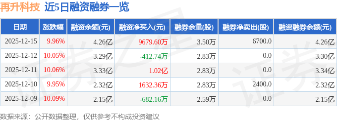 再升科技融资融券信息显示,融资方面,当日融资买入3.0亿元,融资偿还2.04亿元,融资净买入9679.6万元,净买入额两市排名第16。融券方面,融券卖出9800.0股,融券偿还3100.0股,融券余量3.5万股,融券余额32.45万元。融资融券余额4.26亿元。