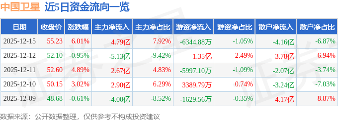 证券之星消息,截至2025年12月15日收盘,中国卫星(600118)报收于55.23元,上涨6.01%,换手率9.48%,成交量112.15万手,成交额60.54亿元。