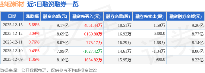 彤程新材融资融券信息显示,融资方面,当日融资买入2.77亿元,融资偿还2.29亿元,融资净买入4851.44万元,连续3日净买入累计1.18亿元。融券方面,融券卖出1.61万股,融券偿还200.0股,融券余量18.51万股,融券余额912.5万元。融资融券余额9.26亿元。