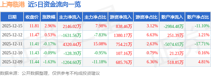 证券之星消息,截至2025年12月15日收盘,上海临港(600848)报收于11.81元,上涨2.96%,换手率0.95%,成交量22.76万手,成交额2.69亿元。