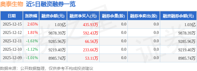 奥泰生物融资融券信息显示,融资方面,当日融资买入854.57万元,融资偿还418.63万元,融资净买入435.93万元,连续3日净买入累计1094.93万元。融券方面,融券卖出0.0股,融券偿还0.0股,融券余量0.0股,融券余额0.0万元。融资融券余额1.03亿元。