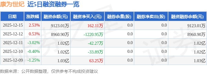 康为世纪融资融券信息显示,融资方面,当日融资买入375.11万元,融资偿还212.99万元,融资净买入162.11万元。融券方面,融券卖出0.0股,融券偿还0.0股,融券余量0.0股,融券余额0.0万元。融资融券余额9123.01万元。