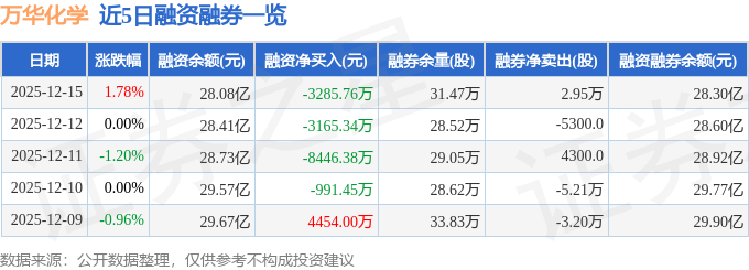 万华化学融资融券信息显示,融资方面,当日融资买入1.41亿元,融资偿还1.74亿元,融资净偿还3285.76万元。融券方面,融券卖出5.6万股,融券偿还2.65万股,融券余量31.47万股,融券余额2193.14万元。融资融券余额28.3亿元。
