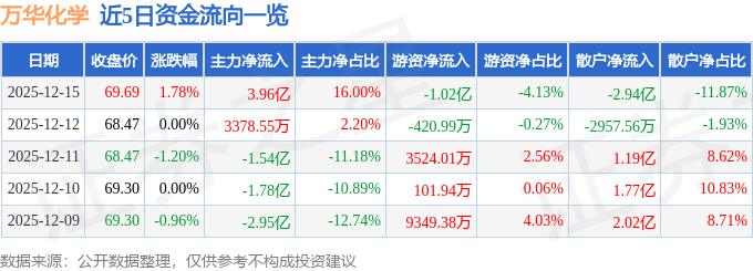 证券之星消息,截至2025年12月15日收盘,万华化学(600309)报收于69.69元,上涨1.78%,换手率1.13%,成交量35.28万手,成交额24.73亿元。