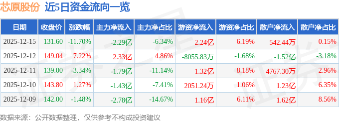 证券之星消息,截至2025年12月15日收盘,芯原股份(688521)报收于131.6元,下跌11.7%,换手率5.31%,成交量26.59万手,成交额36.18亿元。