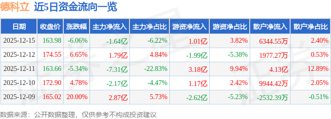 证券之星消息,截至2025年12月15日收盘,德科立(688205)报收于163.98元,下跌6.06%,换手率10.03%,成交量15.87万手,成交额26.42亿元。