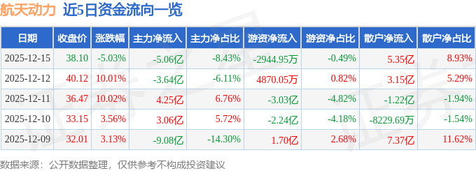 证券之星消息,截至2025年12月15日收盘,航天动力(600343)报收于38.1元,下跌5.03%,换手率24.35%,成交量155.38万手,成交额59.94亿元。
