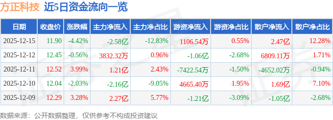证券之星消息,截至2025年12月15日收盘,方正科技(600601)报收于11.9元,下跌4.42%,换手率4.02%,成交量167.73万手,成交额20.12亿元。