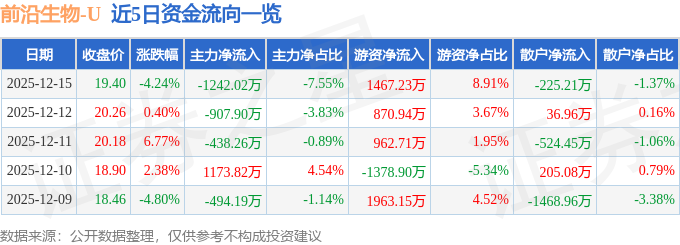 证券之星消息,截至2025年12月15日收盘,前沿生物(688221)报收于19.4元,下跌4.24%,换手率2.23%,成交量8.36万手,成交额1.65亿元。