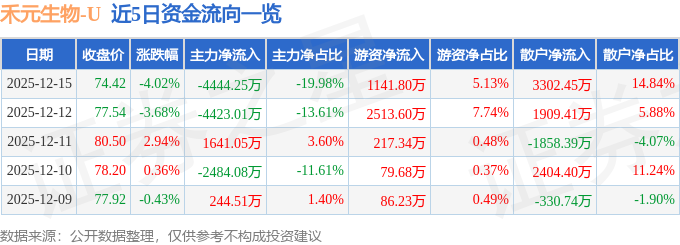 证券之星消息,截至2025年12月15日收盘,禾元生物(688765)报收于74.42元,下跌4.02%,换手率7.18%,成交量2.94万手,成交额2.22亿元。