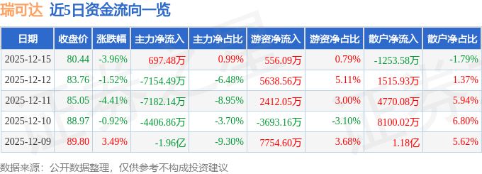 证券之星消息,截至2025年12月15日收盘,瑞可达(688800)报收于80.44元,下跌3.96%,换手率4.21%,成交量8.67万手,成交额7.02亿元。