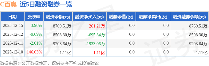 C百奥融资融券信息显示,融资方面,当日融资买入2696.28万元,融资偿还2435.08万元,融资净买入261.21万元。融券方面,融券卖出0.0股,融券偿还0.0股,融券余量0.0股,融券余额0.0万元。融资融券余额8769.51万元。