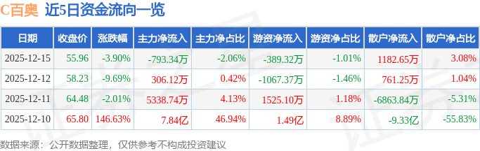 证券之星消息,截至2025年12月15日收盘,C百奥(688796)报收于55.96元,下跌3.9%,换手率18.96%,成交量6.8万手,成交额3.85亿元。