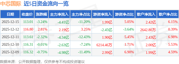证券之星消息,截至2025年12月15日收盘,中芯国际(688981)报收于113.01元,下跌3.24%,换手率1.71%,成交量34.24万手,成交额39.34亿元。