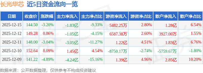 12月15日的资金流向数据方面,主力资金净流出1.83亿元,占总成交额9.33%,游资资金净流入5482.25万元,占总成交额2.8%,散户资金净流入1.28亿元,占总成交额6.54%。