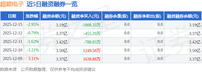 超颖电子融资融券信息显示,融资方面,当日融资买入2010.69万元,融资偿还3819.03万元,融资净偿还1808.33万元。融券方面,融券卖出0.0股,融券偿还0.0股,融券余量0.0股,融券余额0.0万元。融资融券余额3.19亿元。