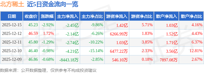 证券之星消息,截至2025年12月15日收盘,北方稀土(600111)报收于45.23元,下跌2.92%,换手率1.51%,成交量54.45万手,成交额24.81亿元。