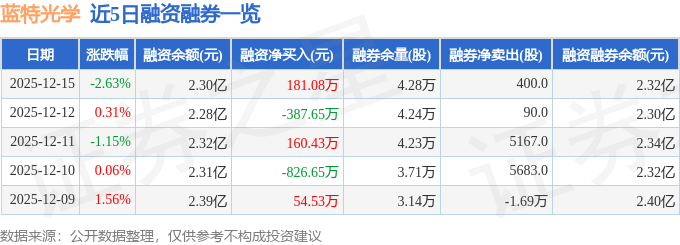 蓝特光学融资融券信息显示,融资方面,当日融资买入1616.39万元,融资偿还1435.31万元,融资净买入181.08万元。融券方面,融券卖出3200.0股,融券偿还2800.0股,融券余量4.28万股,融券余额150.27万元。融资融券余额2.32亿元。