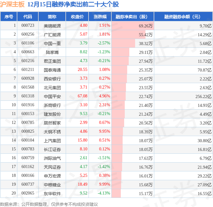 沪深主板融券净卖出前三分别为:美锦能源(000723)融券净卖出69.26万股、广汇能源(600256)融券净卖出55.42万股、中国一重(601106)融券净卖出38.32万股,前20具体见下表: