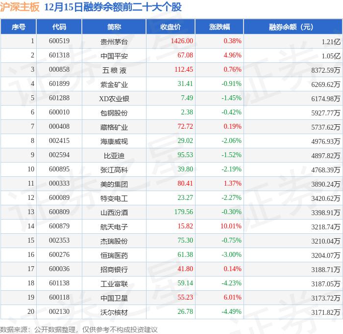 沪深主板融券余额前三分别为:贵州茅台(600519)融券余额1.21亿元、中国平安(601318)融券余额1.05亿元、五 粮 液(000858)融券余额8372.59万元,前20具体见下表: