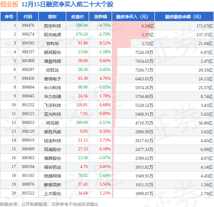 创业板融资净买入前三分别为:胜宏科技(300476)融资净买入6.24亿元、阳光电源(300274)融资净买入5.37亿元、菲利华(300395)融资净买入2.72亿元,前20具体见下表: