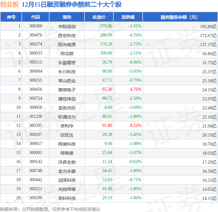 创业板融资融券余额前三分别为:中际旭创(300308)融资融券余额195.8亿元、胜宏科技(300476)融资融券余额172.67亿元、阳光电源(300274)融资融券余额137.37亿元,前20具体见下表: