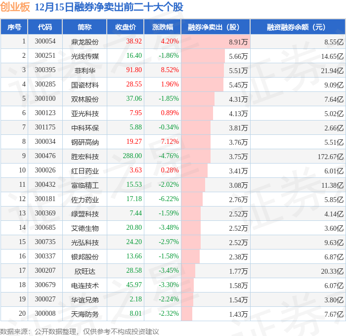 创业板融券净卖出前三分别为:鼎龙股份(300054)融券净卖出8.91万股、光线传媒(300251)融券净卖出5.66万股、菲利华(300395)融券净卖出5.51万股,前20具体见下表: