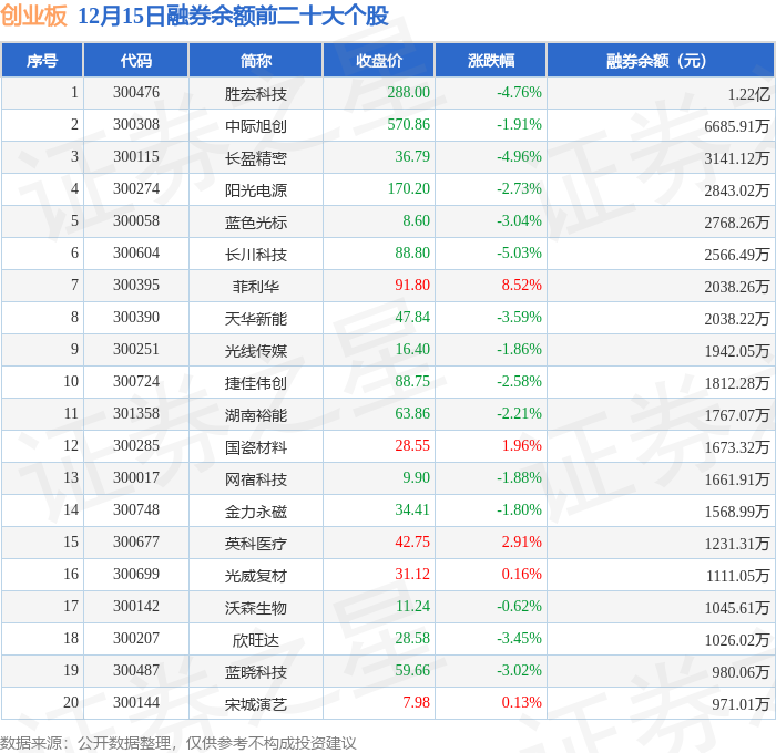 创业板融券余额前三分别为:胜宏科技(300476)融券余额1.22亿元、中际旭创(300308)融券余额6685.91万元、长盈精密(300115)融券余额3141.12万元,前20具体见下表: