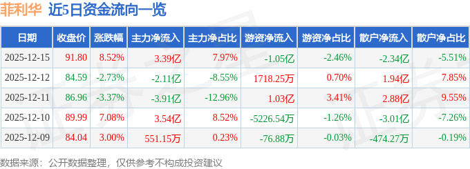12月15日的资金流向数据方面,主力资金净流入3.39亿元,占总成交额7.97%,游资资金净流出1.05亿元,占总成交额2.46%,散户资金净流出2.34亿元,占总成交额5.51%。