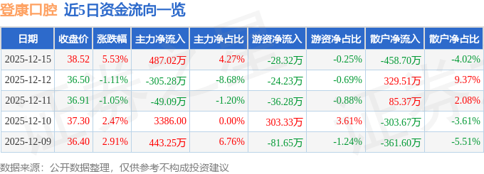 证券之星消息,截至2025年12月15日收盘,登康口腔(001328)报收于38.52元,上涨5.53%,换手率6.93%,成交量2.98万手,成交额1.14亿元。
