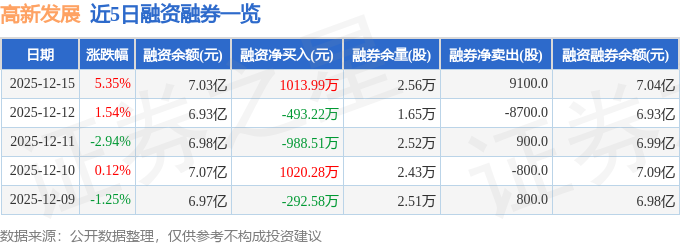 高新发展融资融券信息显示,融资方面,当日融资买入8171.73万元,融资偿还7157.74万元,融资净买入1013.99万元。融券方面,融券卖出1.02万股,融券偿还1100.0股,融券余量2.56万股,融券余额113.92万元。融资融券余额7.04亿元。