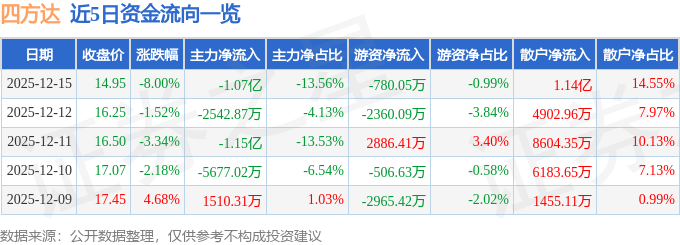 证券之星消息,截至2025年12月15日收盘,四方达(300179)报收于14.95元,下跌8.0%,换手率13.77%,成交量51.5万手,成交额7.87亿元。