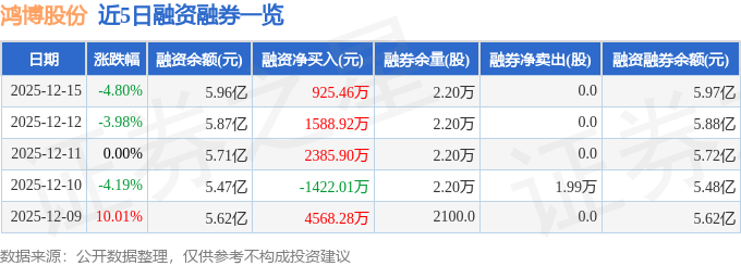 鸿博股份融资融券信息显示,融资方面,当日融资买入5068.63万元,融资偿还4143.17万元,融资净买入925.46万元,连续3日净买入累计4900.28万元。融券方面,融券卖出0.0股,融券偿还0.0股,融券余量2.2万股,融券余额35.38万元。融资融券余额5.97亿元。