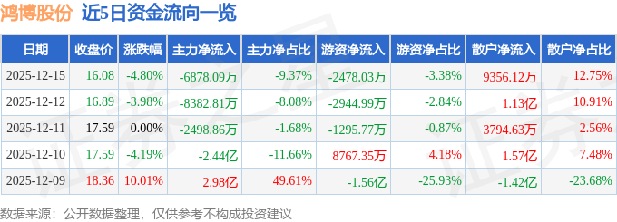证券之星消息,截至2025年12月15日收盘,鸿博股份(002229)报收于16.08元,下跌4.8%,换手率9.21%,成交量45.41万手,成交额7.34亿元。