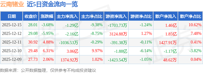 证券之星消息,截至2025年12月15日收盘,云南锗业(002428)报收于28.01元,下跌3.68%,换手率7.46%,成交量48.69万手,成交额13.79亿元。