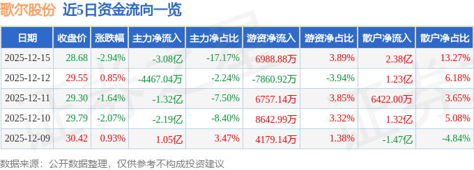 证券之星消息,截至2025年12月15日收盘,歌尔股份(002241)报收于28.68元,下跌2.94%,换手率1.98%,成交量62.04万手,成交额17.95亿元。