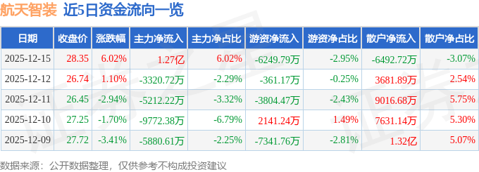 证券之星消息,截至2025年12月15日收盘,航天智装(300455)报收于28.35元,上涨6.02%,换手率10.68%,成交量75.68万手,成交额21.18亿元。