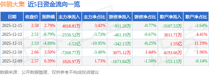 证券之星消息,截至2025年12月15日收盘,供销大集(000564)报收于2.58元,上涨2.79%,换手率3.11%,成交量458.08万手,成交额11.77亿元。